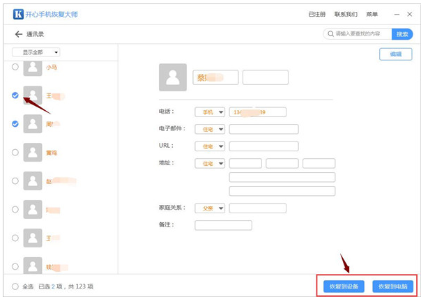 3、在扫描结果界面我们可以看到两种颜色的字体,黄色的是已经删除的数据;黑色是仍在手机中的数据,我们勾选需要恢复的电话号码数据,然后点击【恢复到电脑】就可以备份到电脑中;如果点击【恢复到设备】可以将找回的通讯录联系人直接还原到设备中的,十分方便。