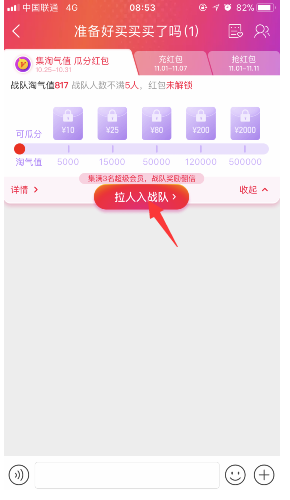1、打开手机淘宝app,在消息里进入自己的战队群,然后点击拉人入战队,如图: