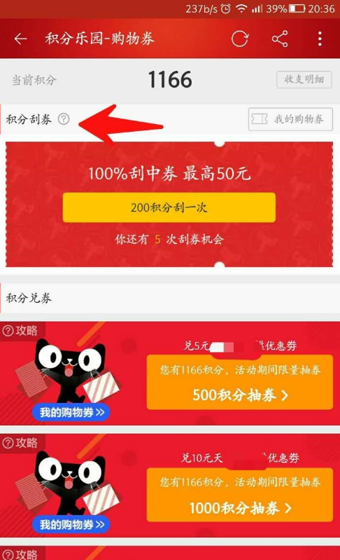 4、还可以进行“积分兑换购物券”,这里有1166积分,所以选择1000积分兑换10元购物券,兑换成功。