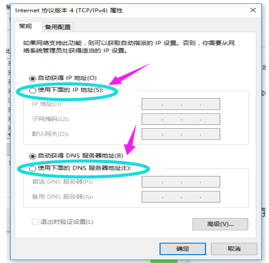 7、勾选“使用下面的IP地址”和“使用下面的DNS服务器地址”,