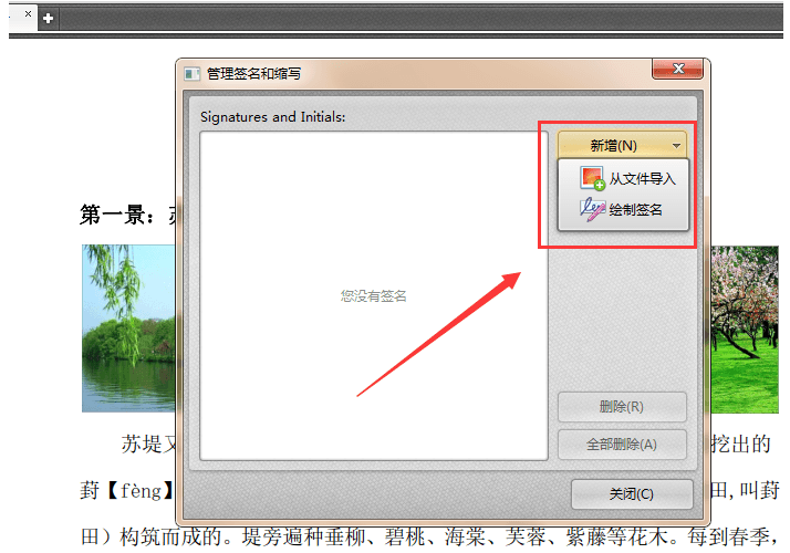 3、进入管理签名与缩写界面,点击“新增”按钮,如果已经准备好签名文件,那么只需要点击“从文件导入”进行导入就好了,或者点击“绘制签名”选项,进行签名绘制。