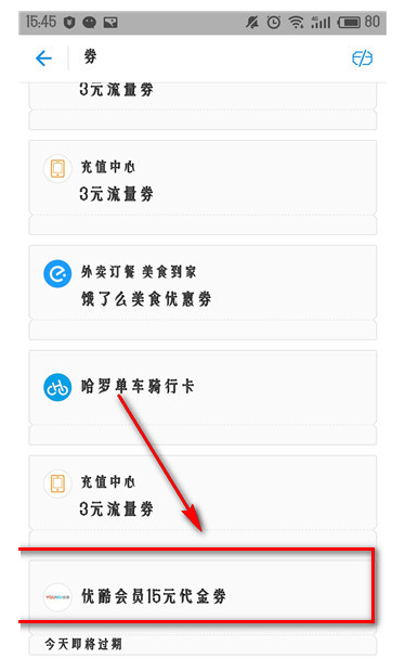 4、其中就有优酷会员啦,小编就没有那么走运,只有一张15元的代金券,