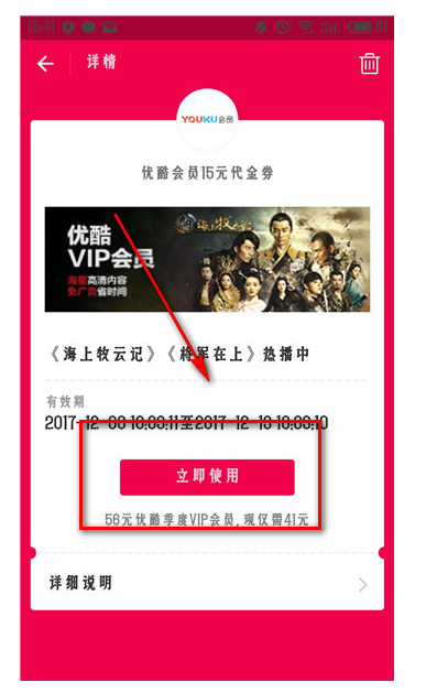 找到你领取的优酷会员券,点击立即使用就可以辣,