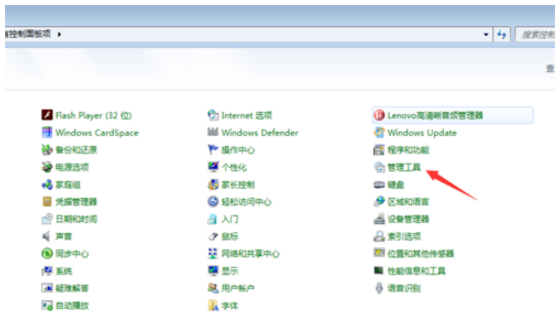 在弹出的各项选项中,找到最后一排的中间位置,点击管理工具选项。