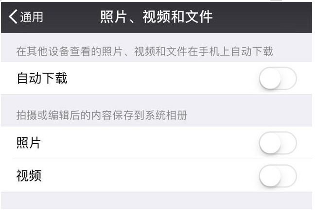 第二个,打开微信设置,在通用里找到“照片、视频和文件,关闭自动下载,因为我们平时跟亲朋好友的聊天信息,看到的照片或者视频和文件,都会保存到你的相册里。