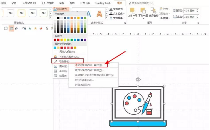 为了方便调用,一般情况下,我们建议将取色器功能移动到快捷访问工具栏,选中任一形状,点击“格式”—“形状填充”—“取色器”,右击菜单,将取色器添加到快捷访问工具栏: