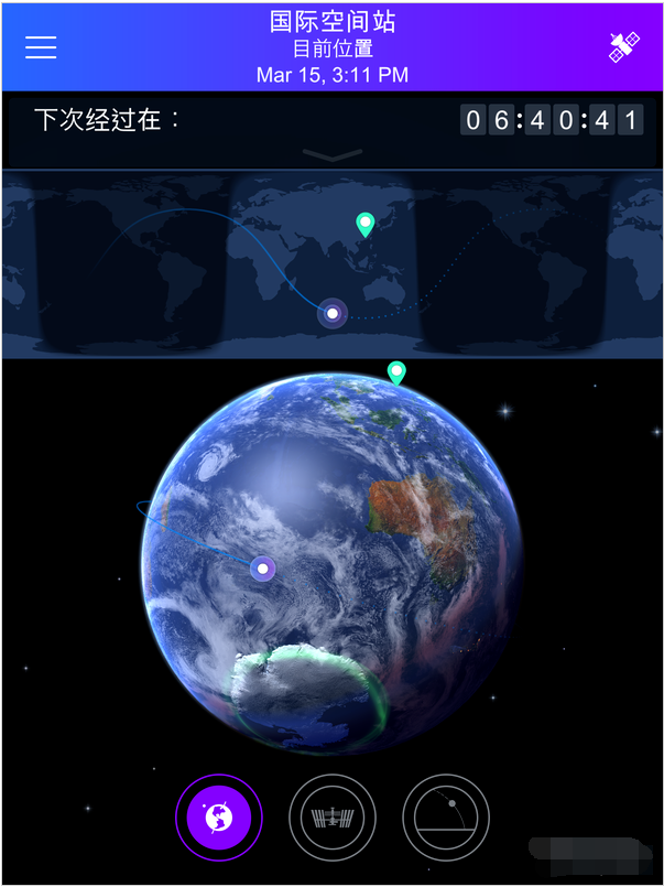 空中移动的那个最亮的星星,那可能是人造卫星。国际空间站什么时候会飞到我的观察位置呢?satellite tracker(卫星追踪器)可以提供国际空间站及可见卫星经过的预测,提醒用户多长时间后国家空间站将开始经过你所在的位置,用户可用该应用追踪空间站及查看星星位置。