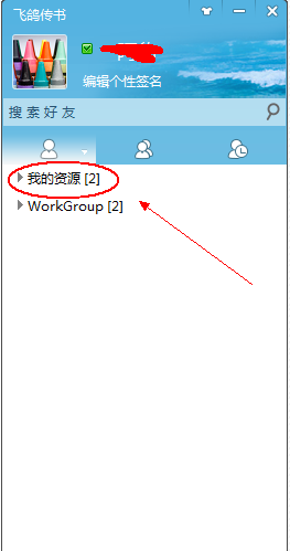 1、先打开飞鸽传书,找到软件窗口的“我的资源”菜单,单击展开菜单,