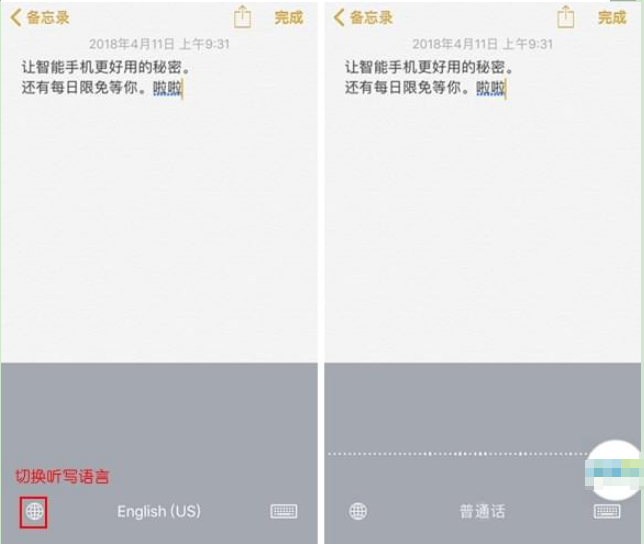 在听写过程中,通过点击「地球」来切换语言。