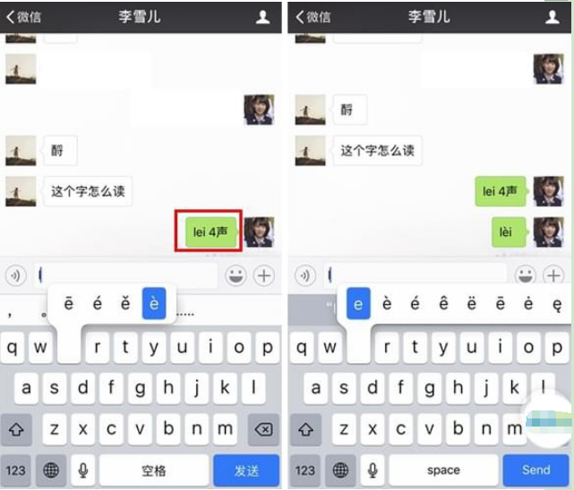 在全键盘的拼音输入界面(左图),轻按需注音的韵母不放,会出现该韵母的不同声调;如果是在英文键盘界面操作(右图),出现的形式会更多。