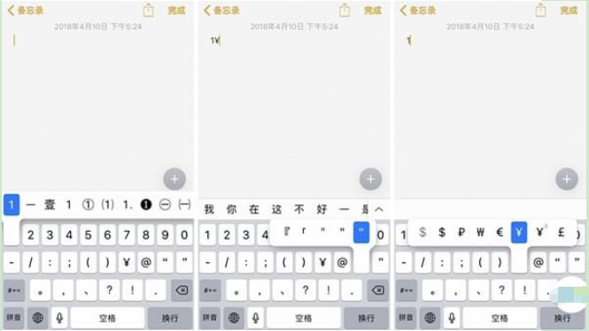 在全键盘的输入界面轻按数字不放,则会出现数字的特殊形式,以此类推,还有货币符号和标点符号的多种形式。