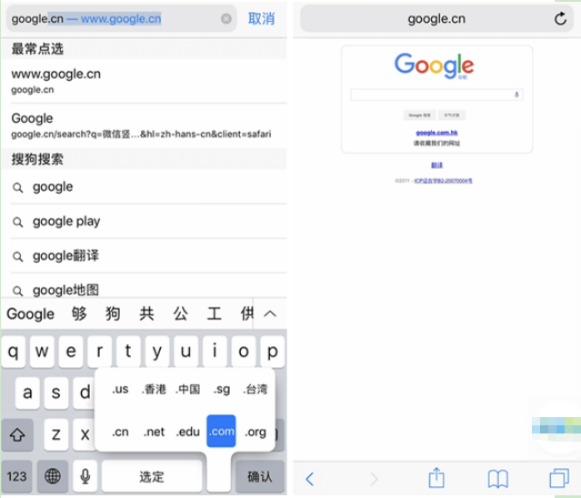 在浏览器中输入一个网址,长按键盘右下角的「.」,会出来一系列网址的后缀,选择正确的即可。