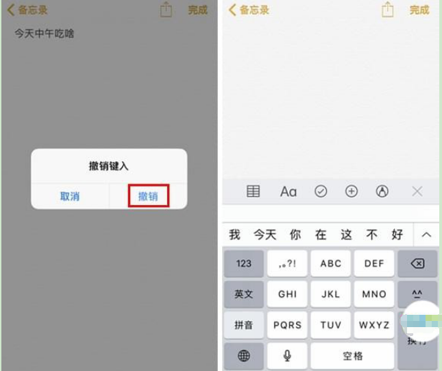 当你在手机上打了一些字又想删除,只需要摇动手机,手机就会提示「撤销键入」,点击「撤销」即可删除刚刚键入的文字、操作。