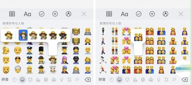 在iOS8的系统下,苹果为emoji表情增加了多种肤色,长按人物表情,会看到除了默认肤色外还有五种肤色可供选择,不过如果是群体人物则没有肤色可选择。