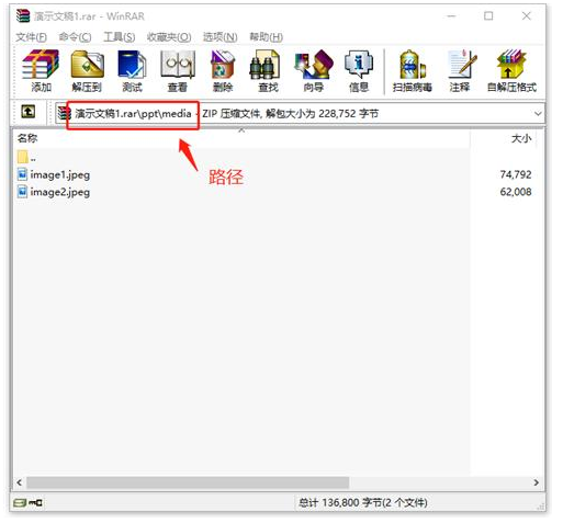 接着,把要保存图片的文档复制多一个,选择“重命名”将它的后缀名改为“rar”,再把这个压缩包打开,依序打开文件夹PPT(这里以PPT为例,所以是PPT)-media,文档中所有的图片都在这里;
