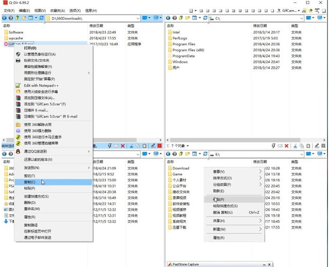 打开软件,发现Windows资源管理器被划分成了四个窗口。假如我们想将D盘的若干文件复制到E盘,直接在此界面上打开D盘复制文件、然后打开E盘粘贴文件。整个操作都是在一个界面上完成的,不需要先打开D盘复制文件,然后在切换到E盘的界面粘贴文件,这样复制粘贴文件将会提高我们的效率!