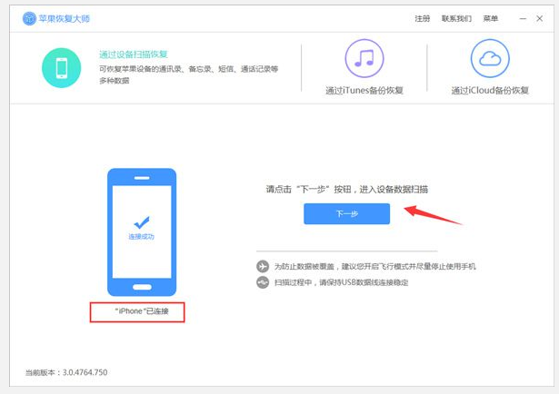 1、打开苹果恢复大师,首页界面如下图,点击【下一步】。