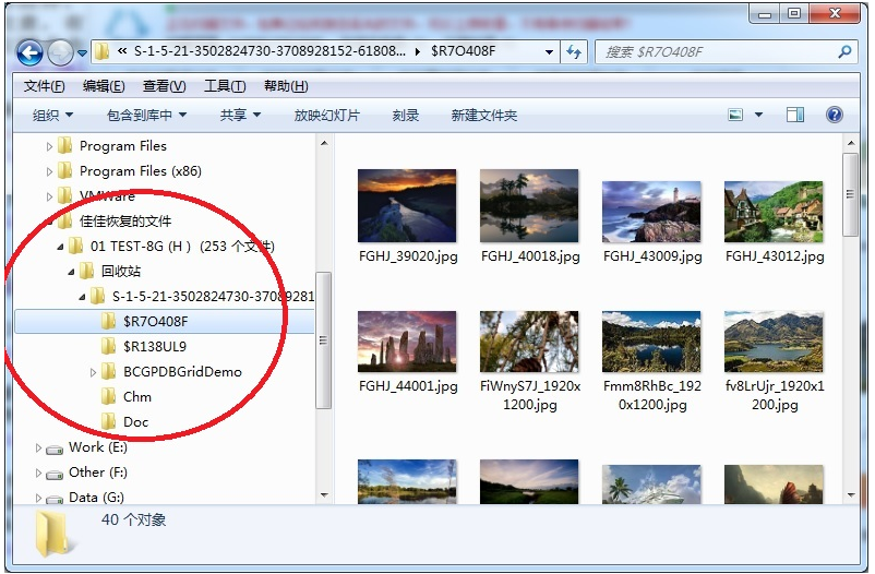 左边树形控件,“01 TEST-8G(H:)(253个文件)”,表示在H盘回收站里找到了253个清空回收站删除的文件。这里要注意,有的文件删除后文件名可能变化,如果找不到您删除的文件,请恢复所有文件,再整理。