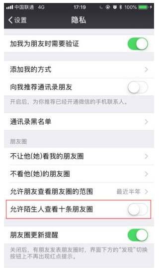 解决方法:设置→隐私→关闭“允许陌生人查看十条朋友圈”