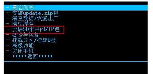 点击这个选项后,手机会进入另一个界面,然后选择第一项--从内存卡选择zip文件,如下图: