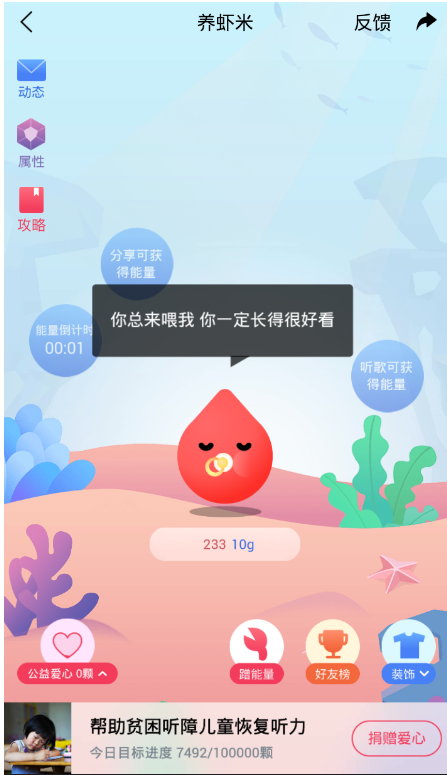 现在可以开始喂养虾米Baby了,首先点击下图红色箭头所指的可收获的能量球(听音乐是可以获得能量球的)。