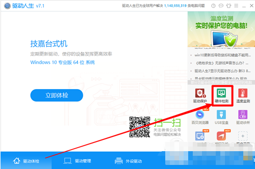 到小康教程站下载驱动人生7,点击右边九宫格上的【硬件检测】。