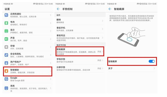 需要先在设置-智能辅助-手势控制-开启“智能截图”,才能操作成功哦~