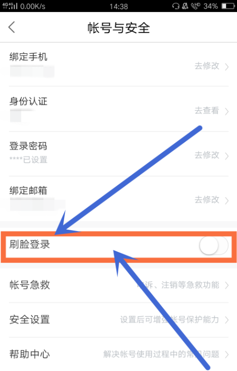 然后在账号与安全中,点击打开刷脸登录开关(此时处于关闭状态),如图所示,