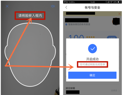 点开启刷脸登录开关后,即可验证自己的面部(脸),按照提示操作即可,如图所示,