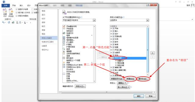 选择选项卡,我选择了“特色功能”,可以自己改;新建一个组,点击“新建组”即可;重命名,便于查找,我将它命名为“朗读”。
