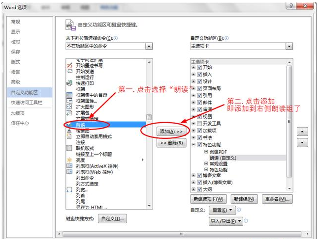 新建组完毕后,先点选“朗读”,然后选择“添加”,这样右边新建的组就有了朗读,回到自己的Word特色功能选项下就能看到它了。