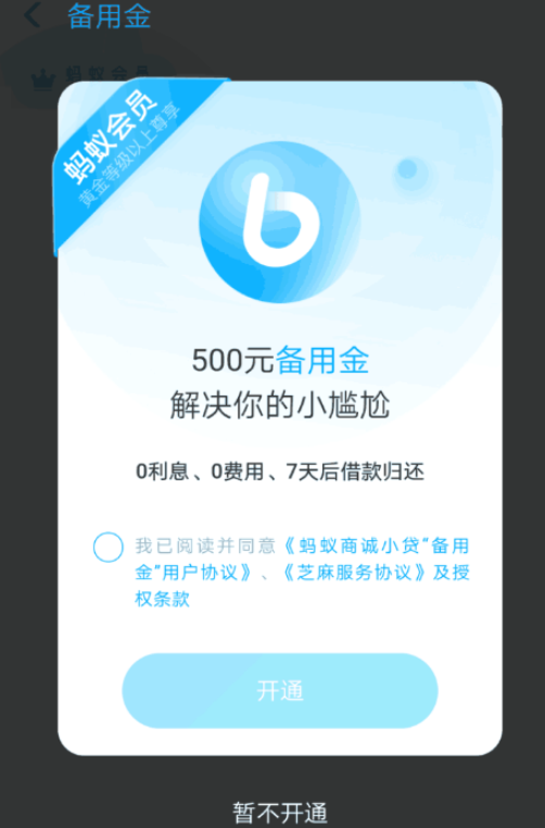 开通条件:支付宝备用金需要蚂蚁会员的等级在黄金(含)等级以上才有资格,且芝麻信用分大于650分、没有负面记录。