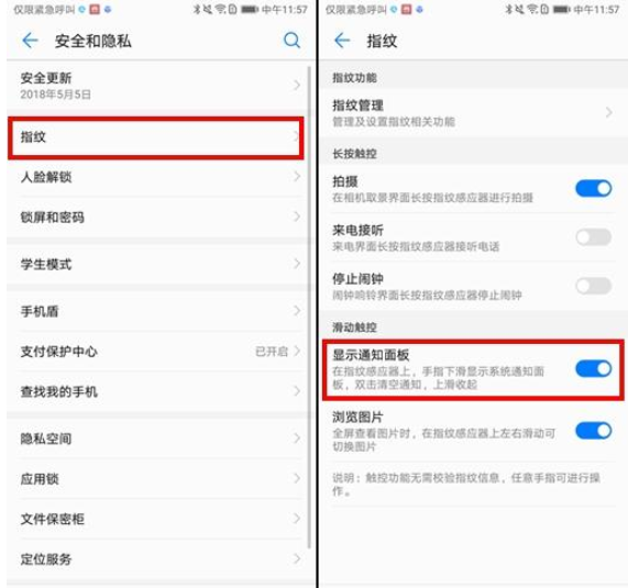 首先要先打开指纹开关,然后点击显示通知面板,就可以如上图这样关闭消息通知了。
