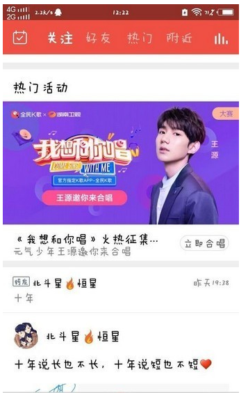 可能进入全民K歌的封面上就会看到《我想和你唱》的公告,或者是看看热门活动,在热门活动上会有《我想和你唱》活动的宣传,我们直接点击进入我想和你唱的活动。