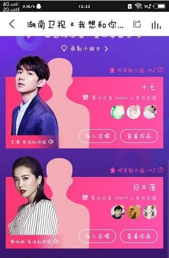 然后你可以选择一个明星来和他合唱,要注意录制合唱视频的时候要有动作和语言,这样会显得更加活泼,当然了,你的唱功是最重要的。