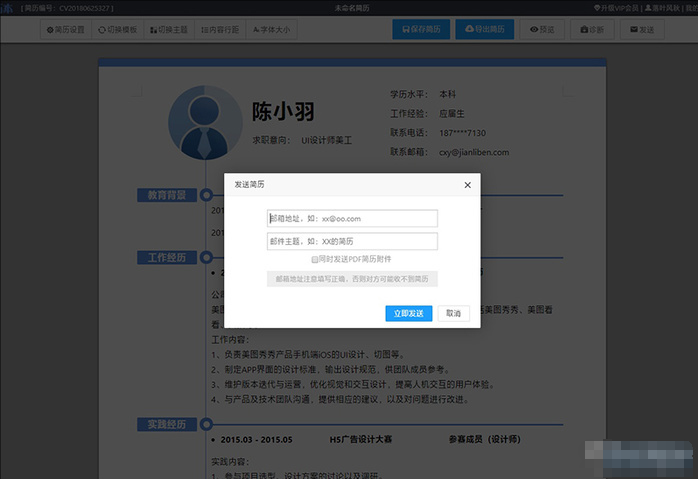 五百丁将编辑页左侧设计为模块控制页,右侧设计为编辑区,所有模块都可以任意添加与删除。和“简历本”相比,“五百丁”有一个最亮眼的地方,那就是通过对简历打分,告诉你简历中还有哪些还能再优化。这对于初入职场的小菜鸟们来说,无疑是一个很贴心的设计。不过“五百丁”不支持做好简历的免费导出,只能通过电子邮件投递。如果确实需要将简历保存导出,就需要交费来充会员了,这大概就算漂亮的代价吧!