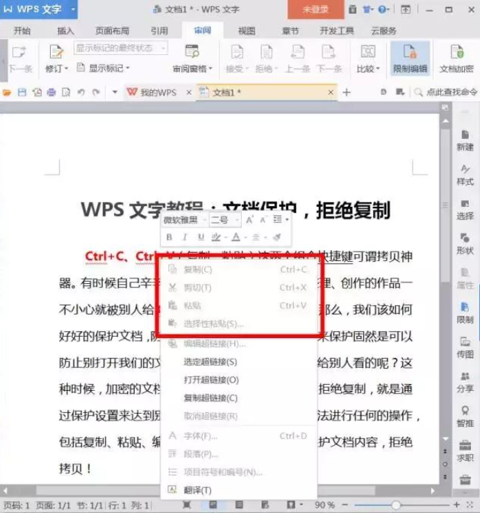 自己辛辛苦苦整理创作的文章作品被别人复制盗用了,想想就心塞!有什么方法可以禁止复制操作呢?通过WPS文字的简单设置,可以让他人无法进行任何操作,请看下文详细讲解。