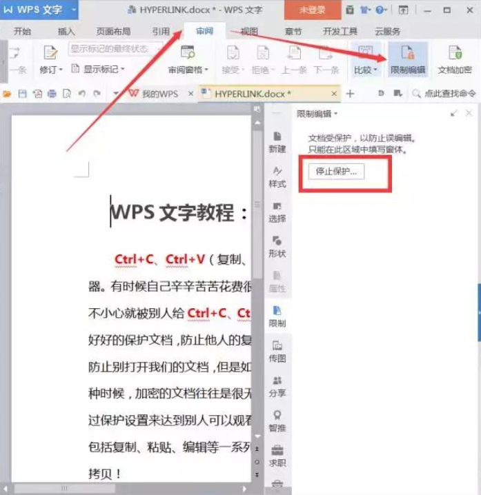 取消文档保护:点击菜单栏【审阅】→【限制编辑】,“停止保护”即可,如下图所示。