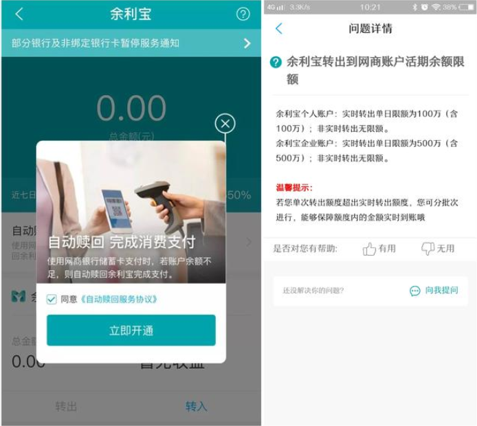 现在余利宝上线了一个新功能,就是“自动赎回,完成消费支付”。据悉,开通这一功能后,用支付宝付钱时可以选择用“网商银行储蓄卡”支付,直接从余利宝里扣钱,几乎可以当成翻版的余额宝。