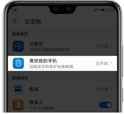 【设置】-【登录华为帐号】-【云空间】-【查找我的手机】开启