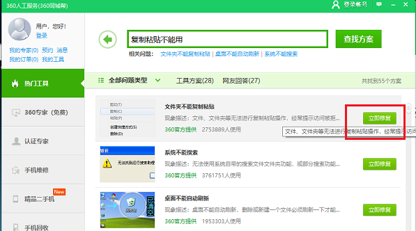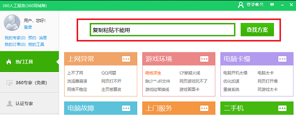 进入360人工服务页面,在搜索框中输入“复制粘贴不能用”,点击查找方案,如下图所示: