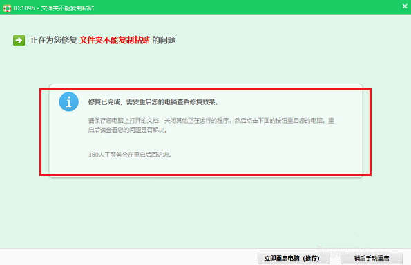 等待一下,问题就修复完成了,重启电脑,看看是否能复制粘贴文件、文件夹,如下图所示: