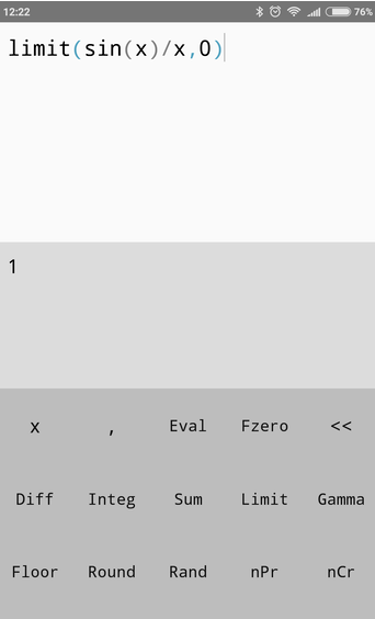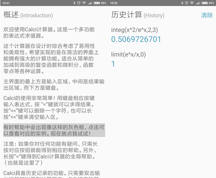 Calc体积非常小,不存在什么申请权限、盗取隐私什么的,且没有广告,十分干净。Calci计算器不仅能够运行最基本的四则运算,还支持求极限、算微积分、复变函数、进制换算等计算。无论你是学生,还是已经走在专业道路上的工程师,这款Calci计算器都能派上用场。Calci计算器的功能强大,不过使用其实还是挺贴心的。一来,它提供了比较详细的使用说明,只要长按“=”,就可以进入到说明界面。二来,它的功能本身是比较易用的,下面举个算极限和算积分的例子。