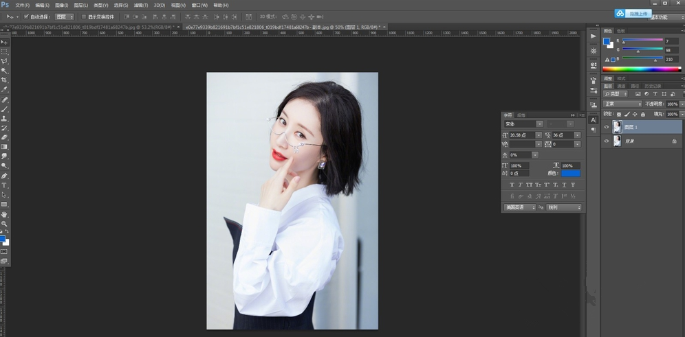 9、在下面新建一个图层,填充蓝色,可以看到头发被扣出来了。