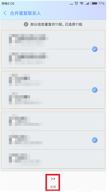 接下来手机会自动识别手机中的重复联系人,识别好后可以进行选择,接着点击底部的【合并】即可完成合并重复联系人。