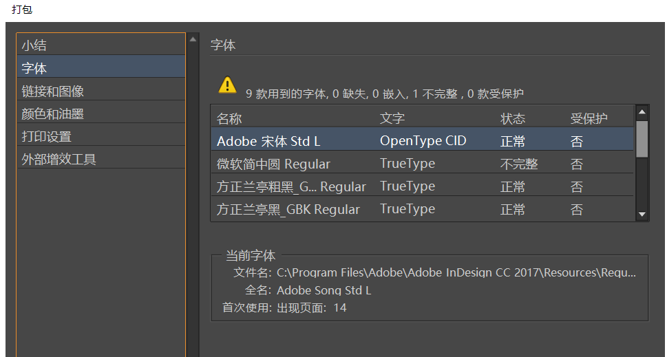 如图,在菜单栏中点击【文件】——【打包】功能,弹出窗口,检查文件,确保文字字体正确、图片正常显示、没有缺少链接,