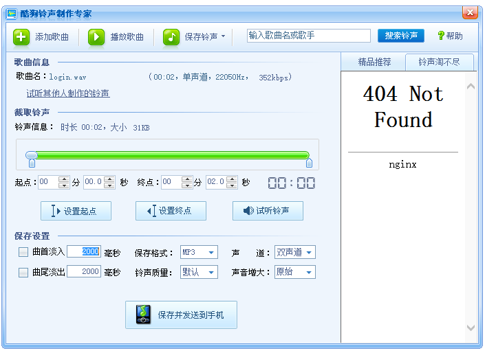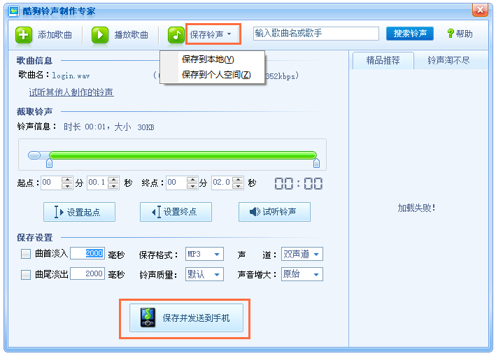 最后,保存铃声文件,这里有三种方式,你可以直接点击【保存并发送到手机】,发送铃声到手机需要使用流量;也可以点击【保存铃声】——【保存到本地/保存到个人空间】。
