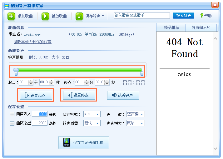 开始截取铃声,小编教你两种方式,一是直接拖动进度条,设置铃声起始时间;二是在听歌过程中点击【设置起点】、【设置终点】,即可确定铃声起点、终点标识,