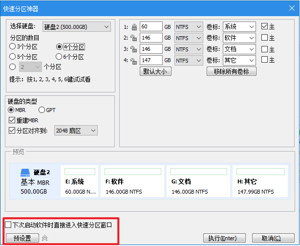 4、勾选【下次启动软件时直接进入快速分区窗口】,往后每一次启动程序,该选项会直接进入“快速分区”窗口;单击【预设】按钮,可以预设默认的分区数量和大小,