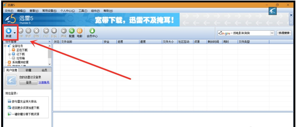 先复制电影片源的网址链接,然后启动迅雷5,进入界面,点击上方的【新建】选项,